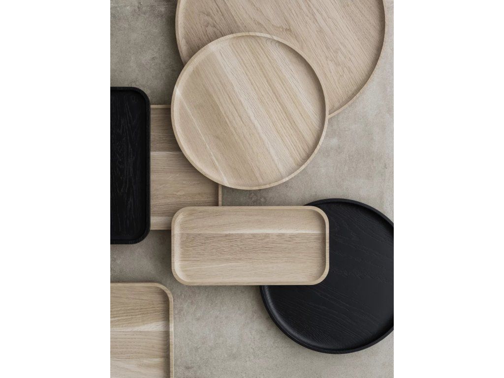 Tăvile atemporale din colecția OKU din lemn de stejar sunt disponibile în mai multe dimensiuni, forme diferite și două culori. Se potrivesc perfect pentru servirea preparatelor, dar și ca accesoriu de interior. Tăvile sunt fabricate din lemn de stejar cu certificat FSC și pot fi curățate cu o cârpă umedă.